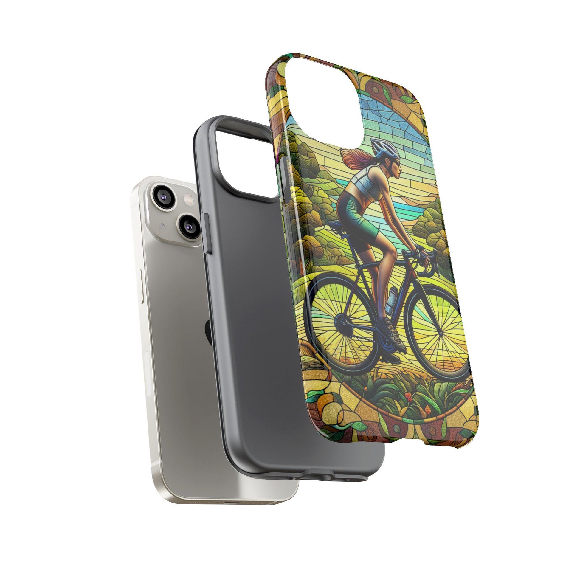 Unleash the love of cycling with our Cycling Phone Case with Stained Glass Effect, designed for iPhone 15, 14, 13, Samsung Galaxy, and Pixel models. Perfect for any cycling lover or as a thoughtful Bike Lover Gift, this case showcases a vibrant cyclist in motion, rendered in an eye-catching stained glass style. The bold black outlines and vivid colors create a dynamic scene that captures the energy and passion of biking.