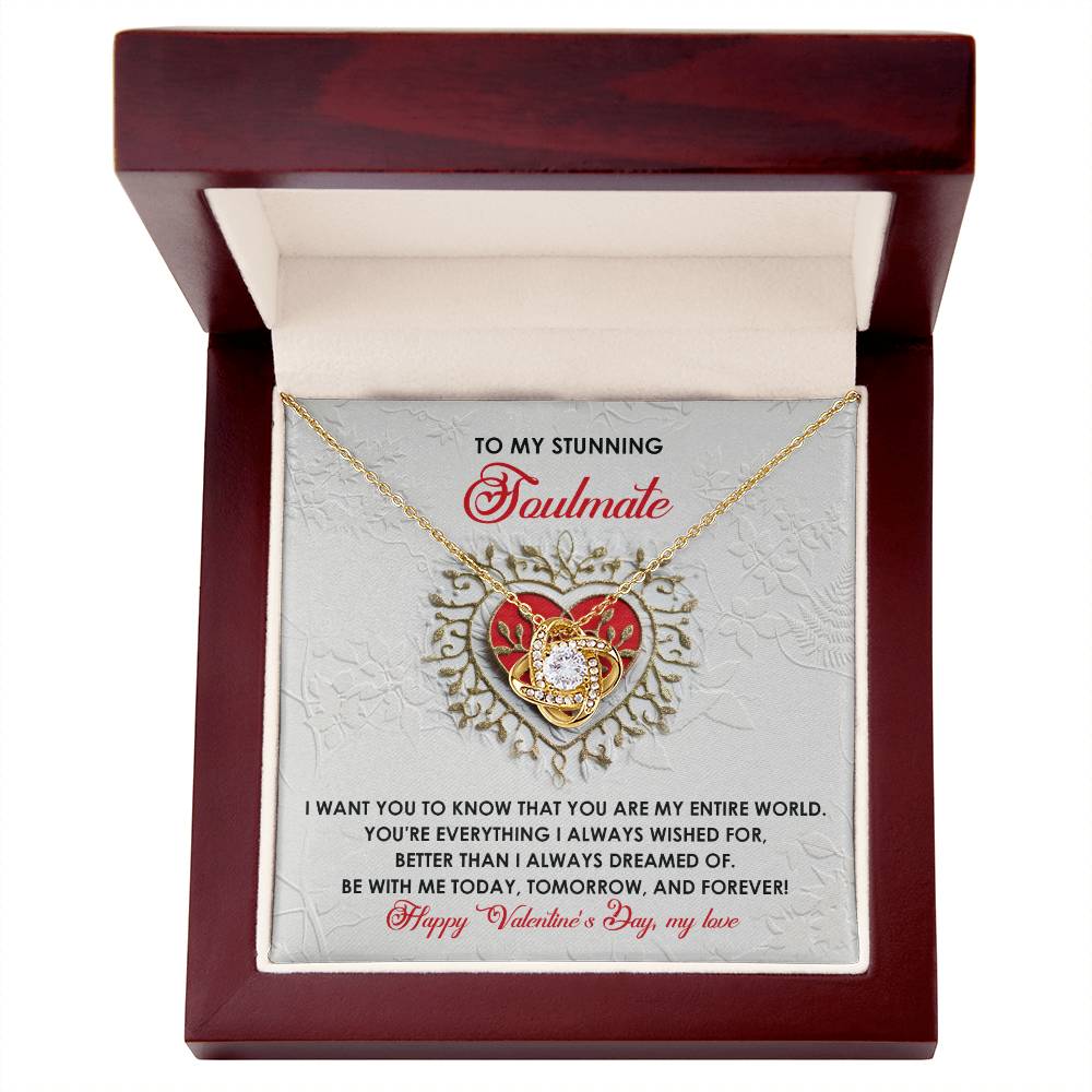 "TO MY STUNNING Soulmate I WANT YOU TO KNOW THAT YOU ARE MY ENTIRE WORLD. YOU'RE EVERYTHING I ALWAYS WISHED FOR, BETTER THAN I ALWAYS DREAMED OF. BE WITH ME TODAY, TOMORROW, AND FOREVER! Happy Valentine's Day, my love"