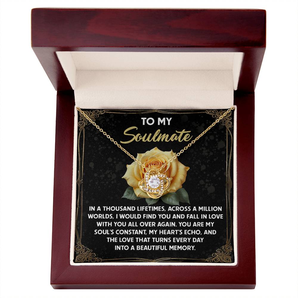 "TO MY Soulmate IN A THOUSAND LIFETIMES, ACROSS A MILLION WORLDS, I WOULD FIND YOU AND FALL IN LOVE WITH YOU ALL OVER AGAIN. YOU ARE MY SOUL'S CONSTANT, MY HEART'S ECHO, AND THE LOVE THAT TURNS EVERY DAY INTO A BEAUTIFUL MEMORY."