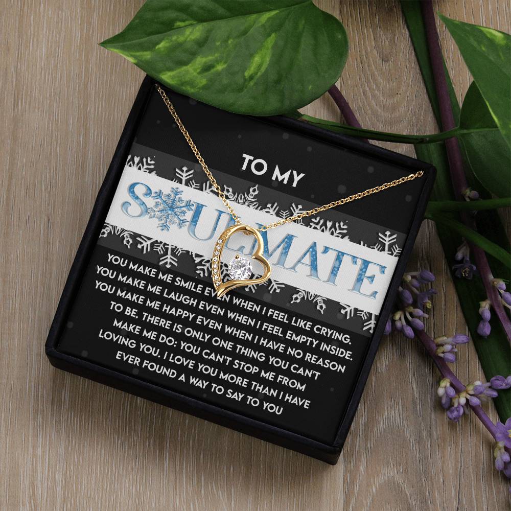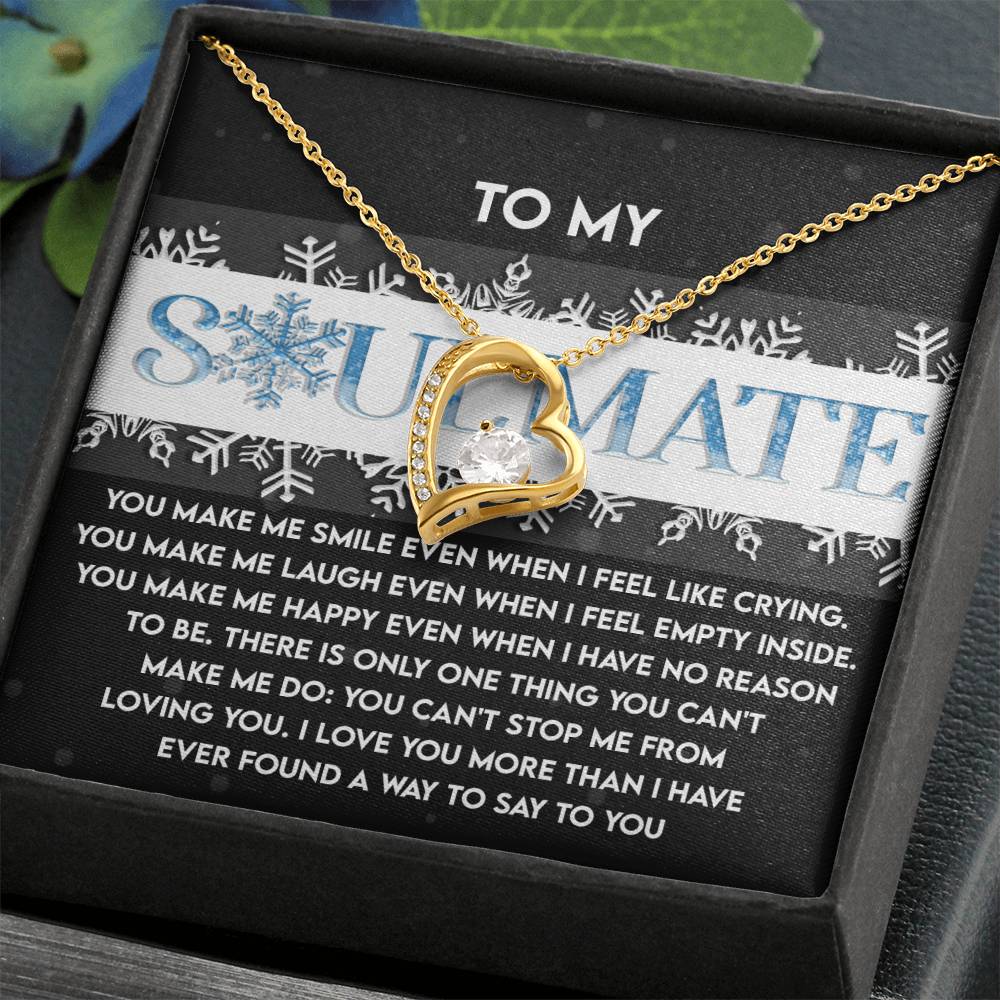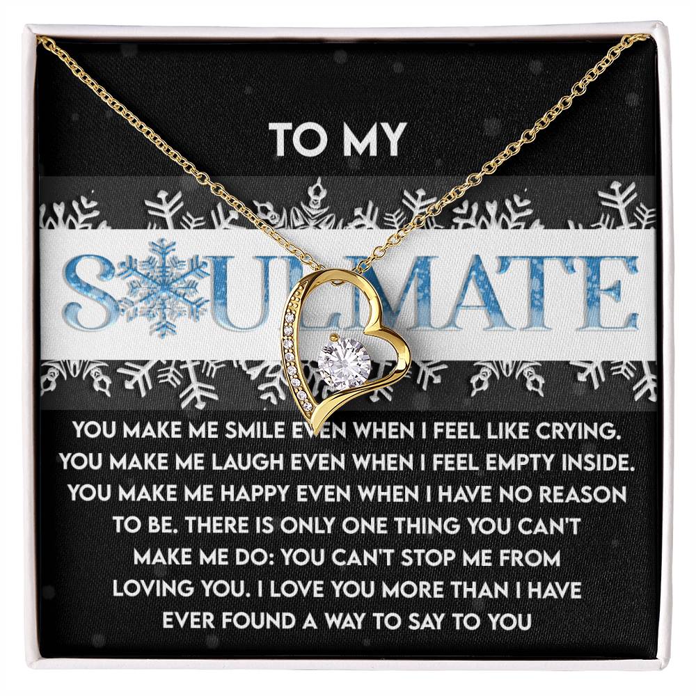 "TO MY SOULMATE YOU MAKE ME SMILE EVEN WHEN I FEEL LIKE CRYING. YOU MAKE ME LAUGH EVEN WHEN I FEEL EMPTY INSIDE. YOU MAKE ME HAPPY EVEN WHEN I HAVE NO REASON TO BE. THERE IS ONLY ONE THING YOU CAN'T MAKE ME DO: YOU CAN'T STOP ME FROM LOVING YOU. I LOVE YOU MORE THAN I HAVE EVER FOUND A WAY TO SAY TO YOU"