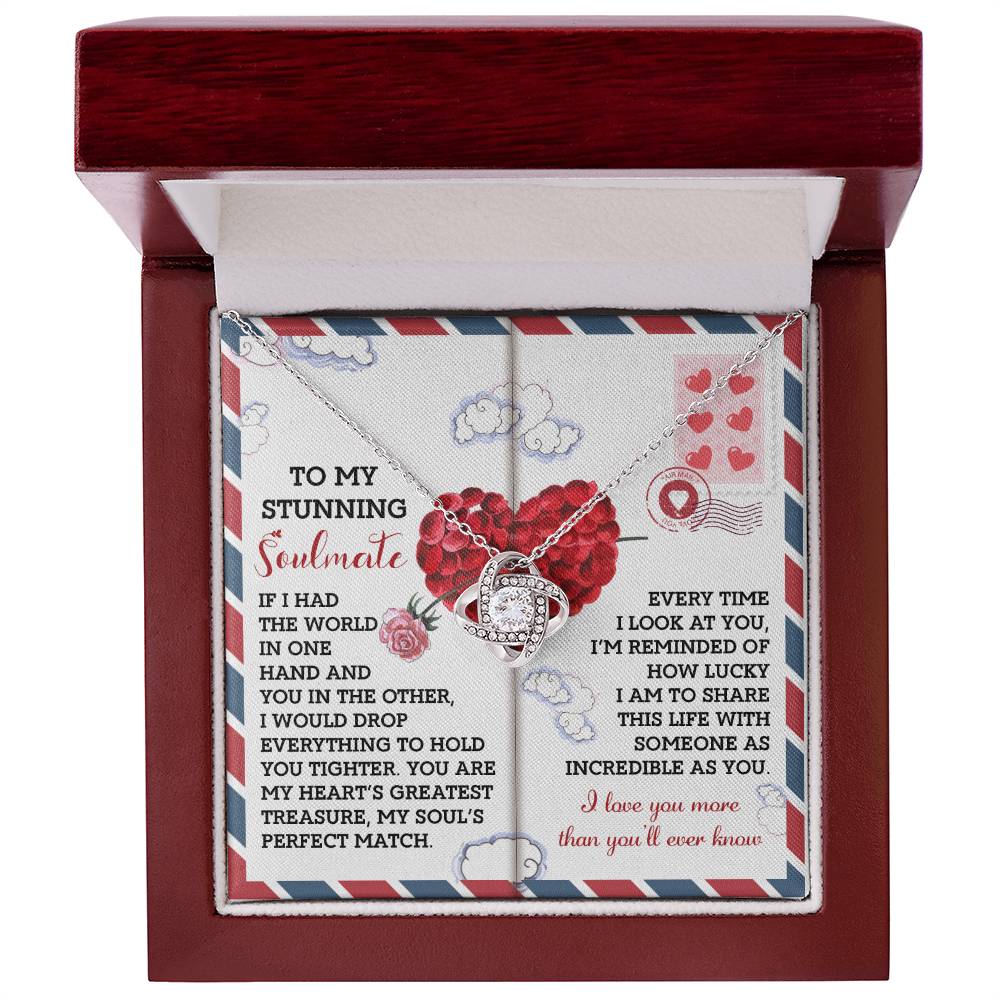 "TO MY STUNNING Soulmate IF I HAD THE WORLD IN ONE HAND AND YOU IN THE OTHER, I WOULD DROP EVERYTHING TO HOLD YOU TIGHTER. YOU ARE MY HEART'S GREATEST TREASURE, MY SOUL'S PERFECT MATCH. EVERY TIME I LOOK AT YOU, I'M REMINDED OF HOW LUCKY I AM TO SHARE THIS LIFE WITH SOMEONE AS INCREDIBLE AS YOU. I love you more than you'll ever know"