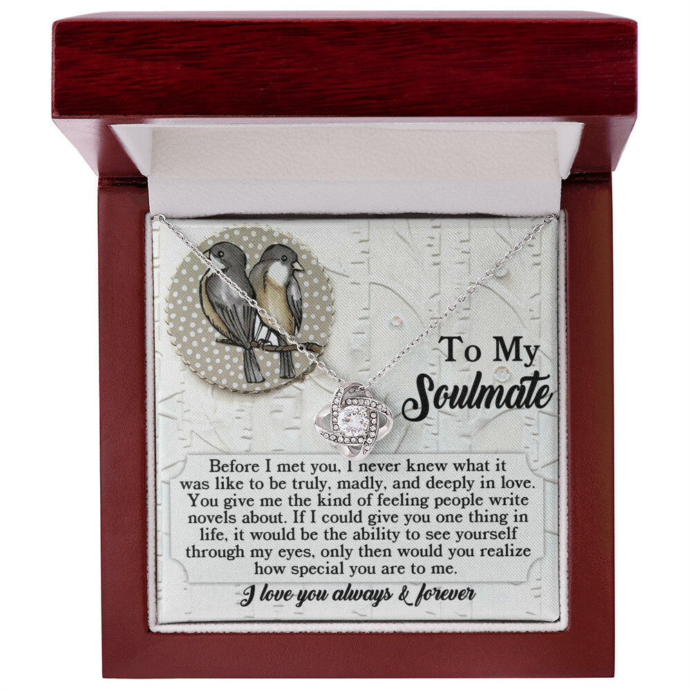“To My Soulmate Before I met you, I never knew what it was like to be truly, madly, and deeply in love. You give me the kind of feeling people write novels about. If I could give you one thing in life, it would be the ability to see yourself through my eyes, only then would you realize how special you are to me. I love you always & forever.”